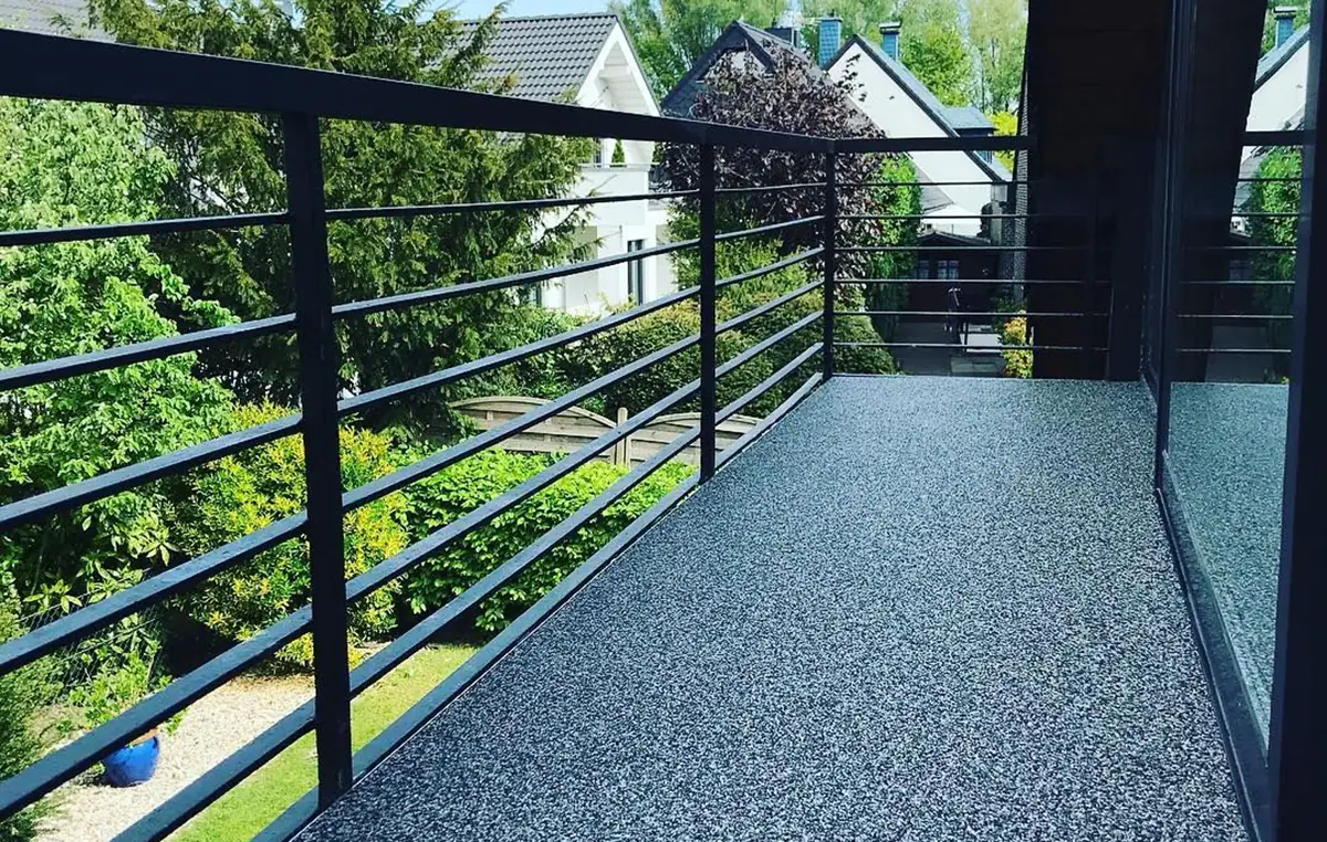 Das Ergebnis ist eine hochwertige, rutschhemmende Fläche mit natürlichem Aussehen — ideal für Terrassen, Balkone, Einfahrten, Treppen und Innenräume. Durch die wasserdurchlässige Struktur entsteht kein Staunasser.